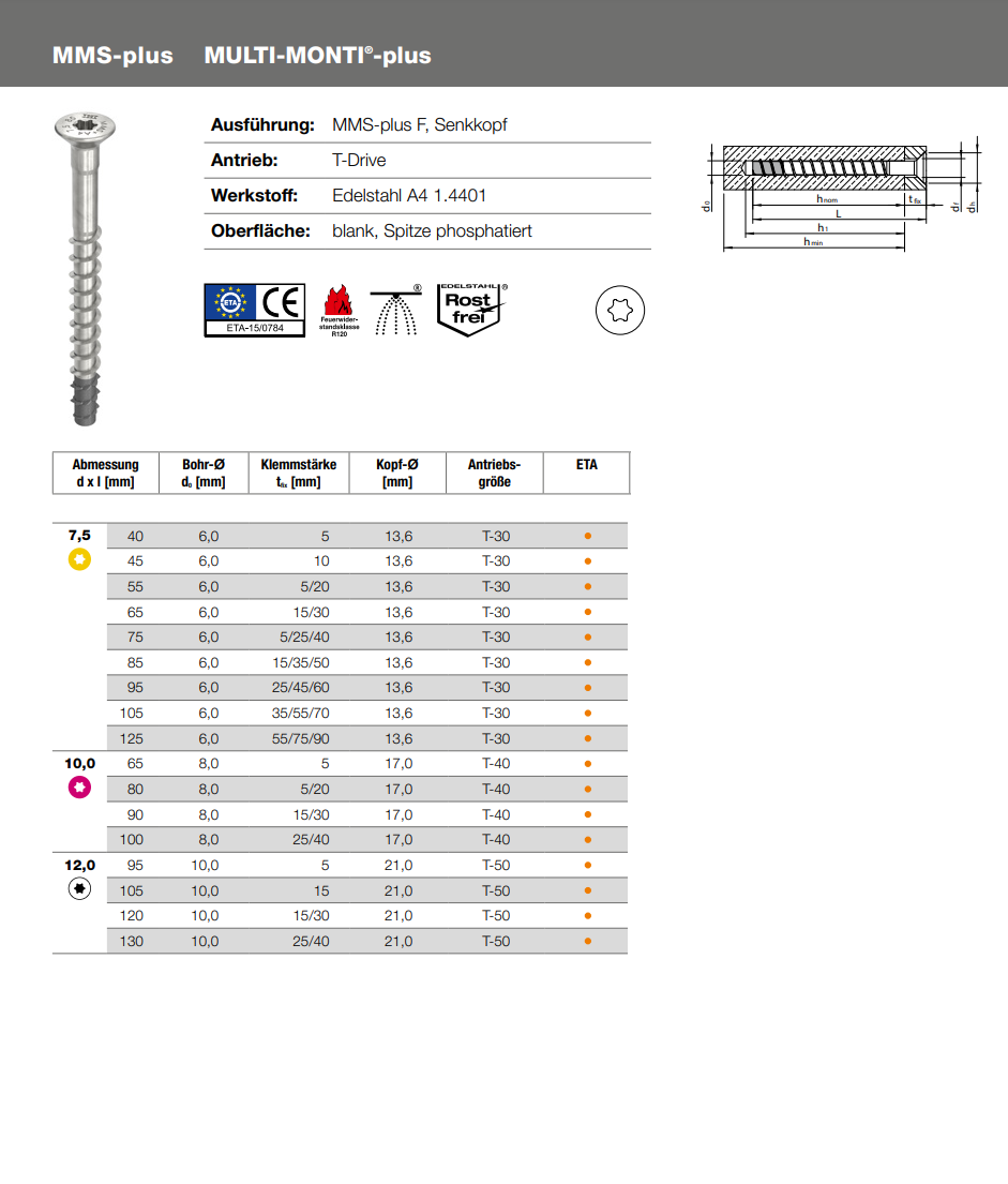Multi-Monti Senkkopf TX, MMS-plus-F A4/1.4401 rostfrei 7,5x75 K:15/25/40