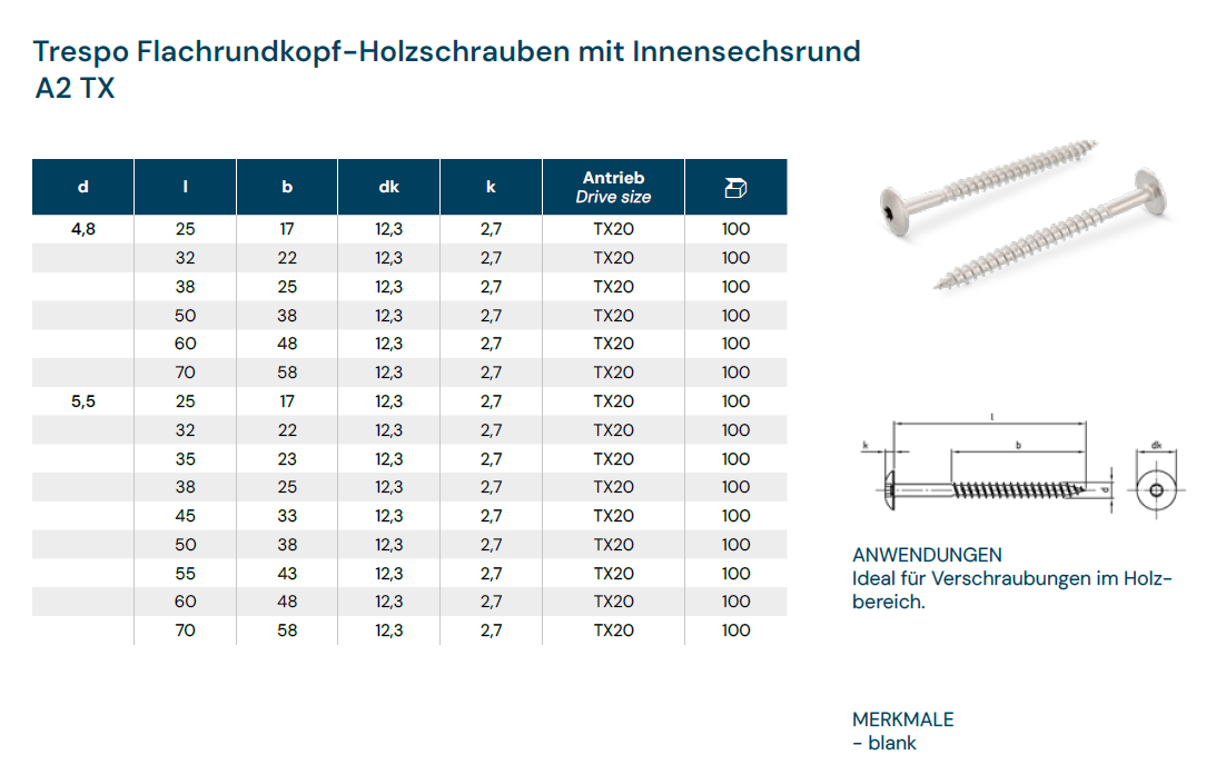 Fassadenschraube mit TX 20, Trespo A2 rostfrei 4,8x50/38