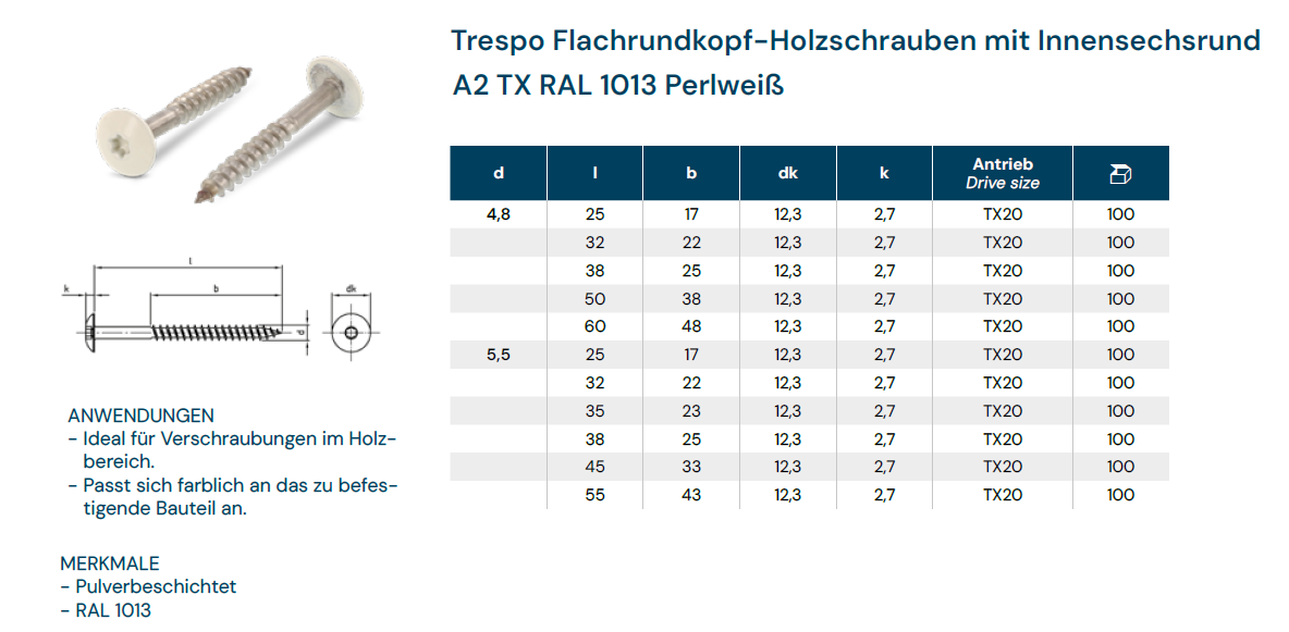 Fassadenschraube mit TX 20, Trespo A2/RAL1013 Perlweiss 4,8x50/38
