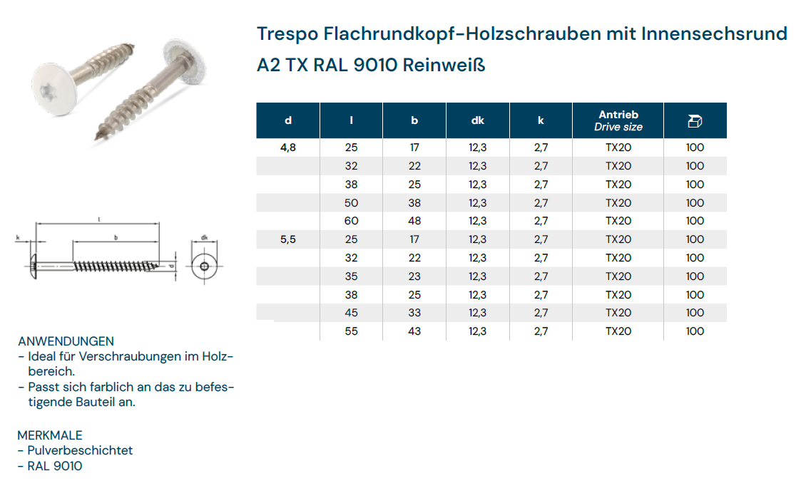 Fassadenschraube mit TX 20, Trespo A2/RAL9010 Reinweiss 4,8x50/38