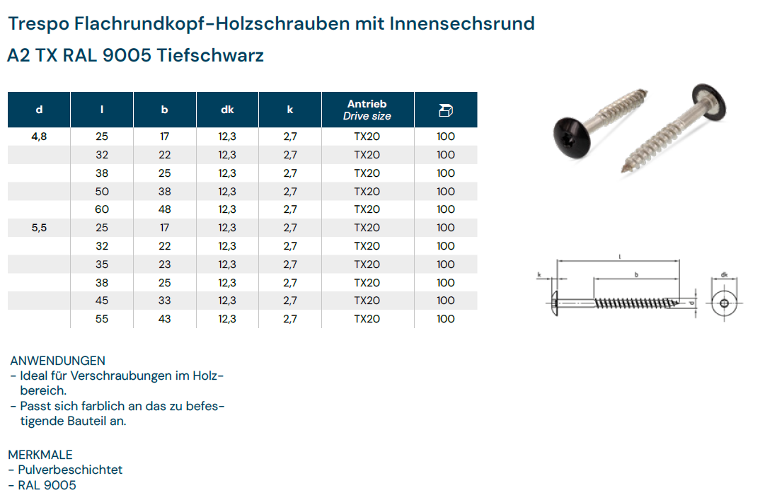 Fassadenschraube mit TX 20, Trespo A2/RAL9005 Tiefschwarz 4,8x50/38