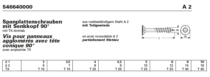Senk-Spanplattenschrauben 90° mit TX mit Schaft, SE-SP-TX-MS A2 rostfrei 8x400/80
