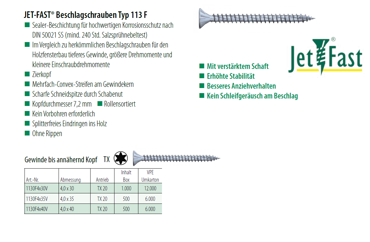 JetFast® Beschlagschrauben Senk-/Zierkopf Torx, Typ 113F Stahl Sealer Coating 4x45