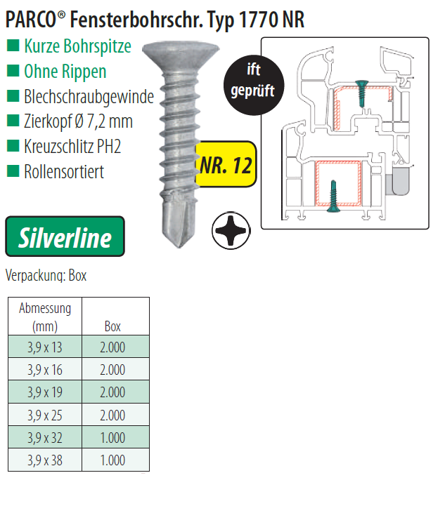PARCO® Fensterbohrschrauben Senk-/Zierkopf PH2, Typ 1770 NR Stahl verzinkt 3,9x28