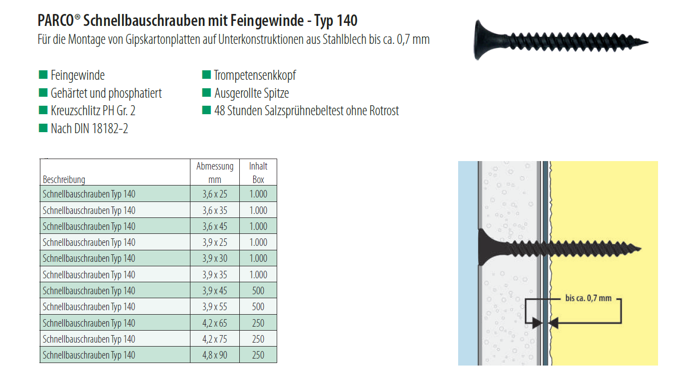 PARCO® Schnellbauschrauben m. Feingewinde, Typ 140 Stahl phosphatiert 3,5/3,6x35