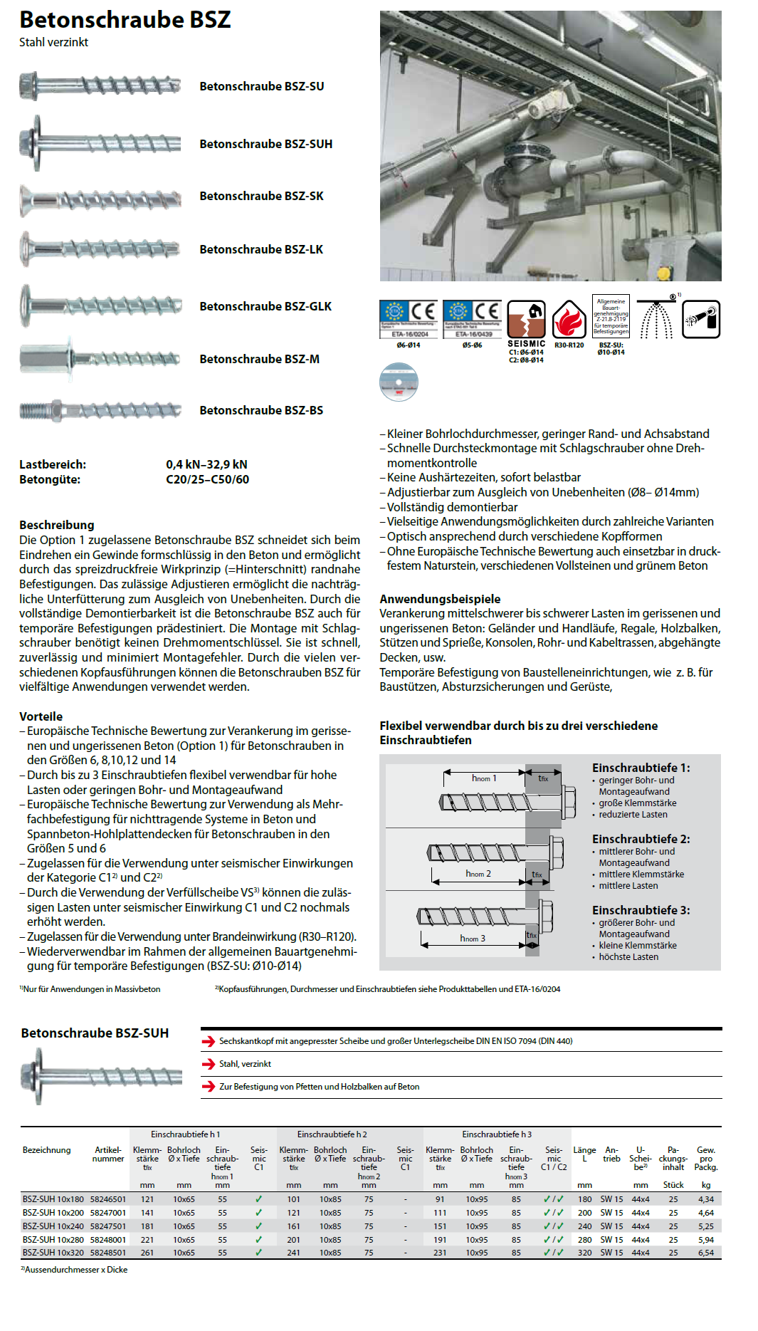 Betonschrauben 6kt.-Kopf mit grosser Scheibe, BSZ-SU-H Stahl verzinkt 10x280 K:191/201/221