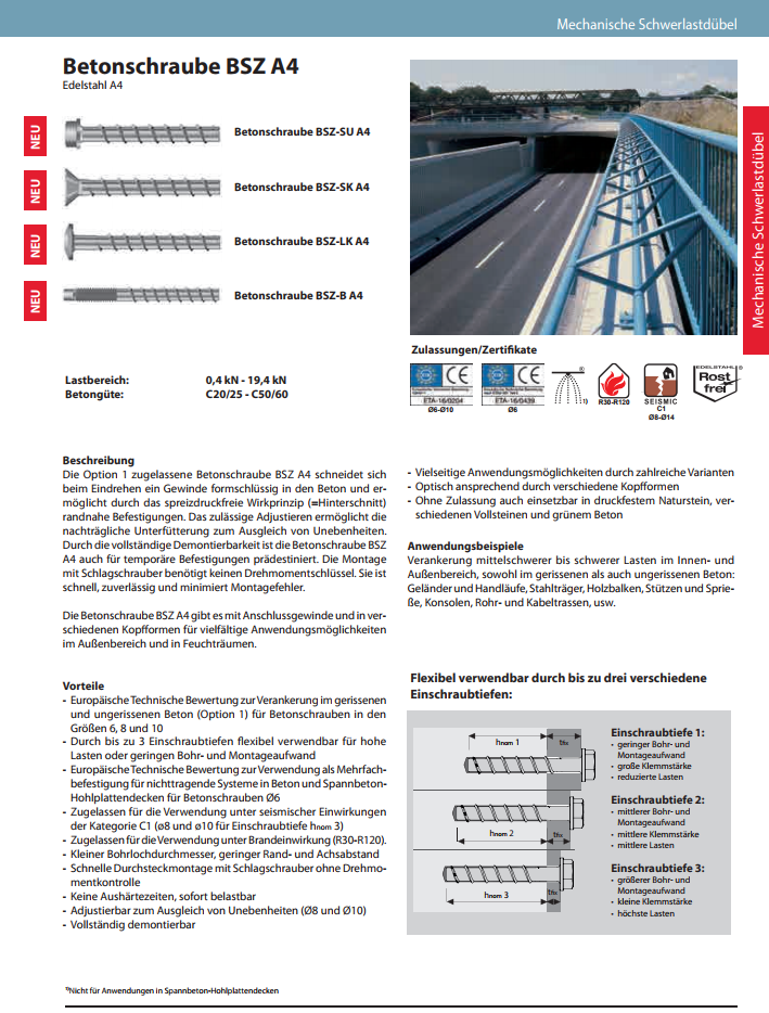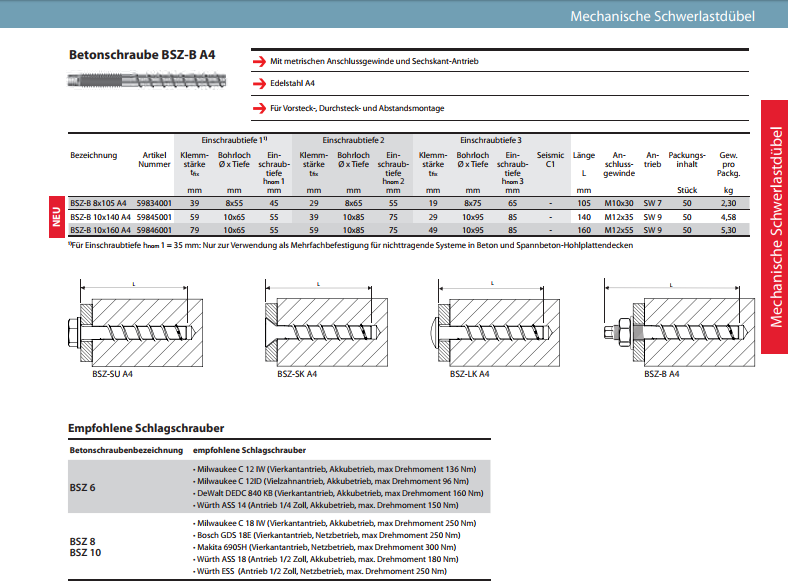 Betonschrauben m. metrischen Anschlussgde., 6-kt., BSZ-B A4 rostfrei 10x140 K:29/39/59