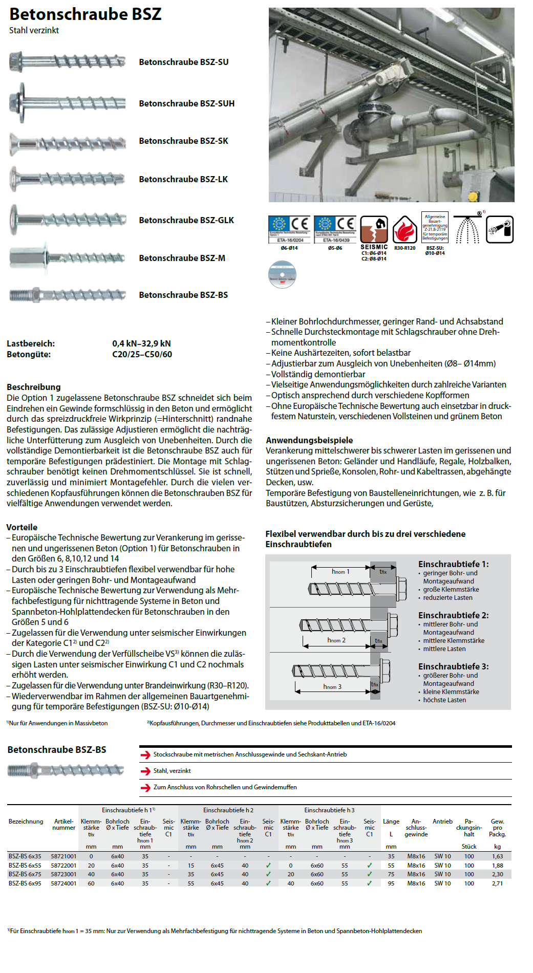Betonschrauben Stockschraube m. 6kt.-Antrieb, BSZ-BS Stahl verzinkt 6x35 K:0