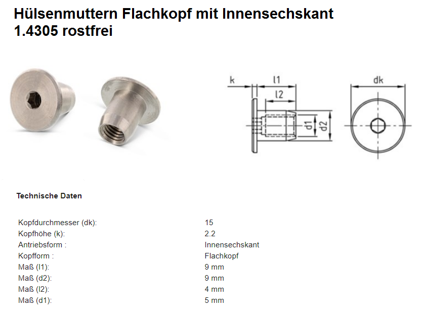 Hülsenmuttern Flachkopf mit Innensechskant, 1.4305 rostfrei M5x9