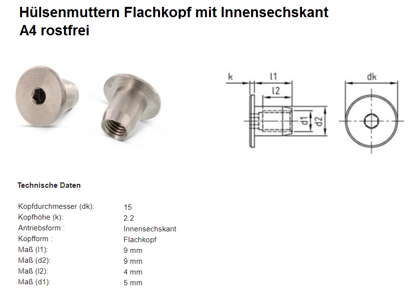 Hülsenmuttern Flachkopf mit Innensechskant, A4 rostfrei M5x9