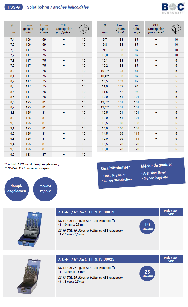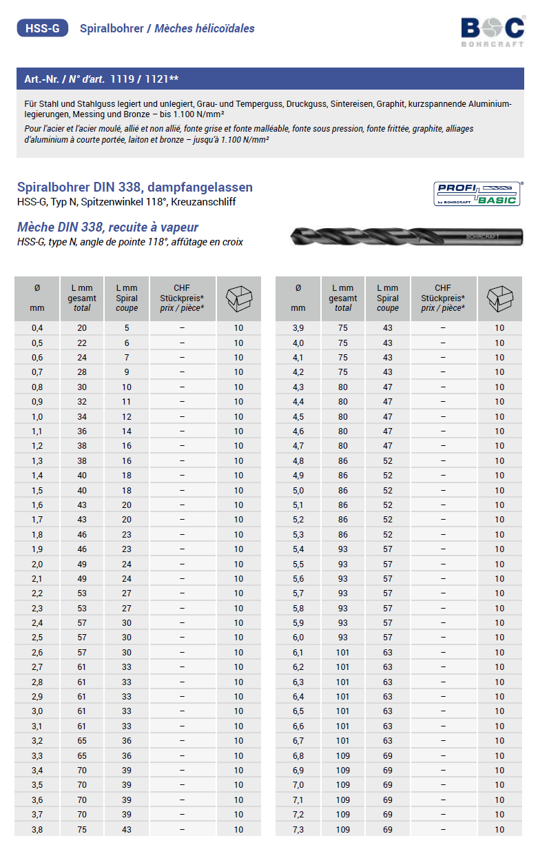 Bohrcraft Spiralbohrer blank, DIN338/Typ N HSS-G 12,4x151/101