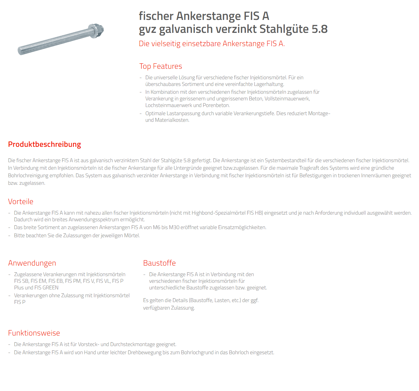 FISCHER Injektions-Ankerstange, FIS A 5.8 verzinkt M8x110 K:39