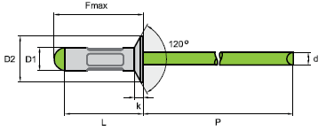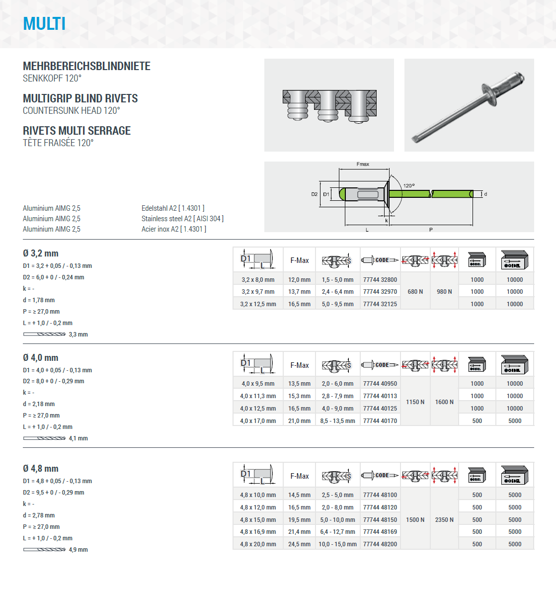 Blindnieten Senkkopf 120°, MULTI, Aluminium-A2 rostfrei 4,8x15 K:5,0-10,0