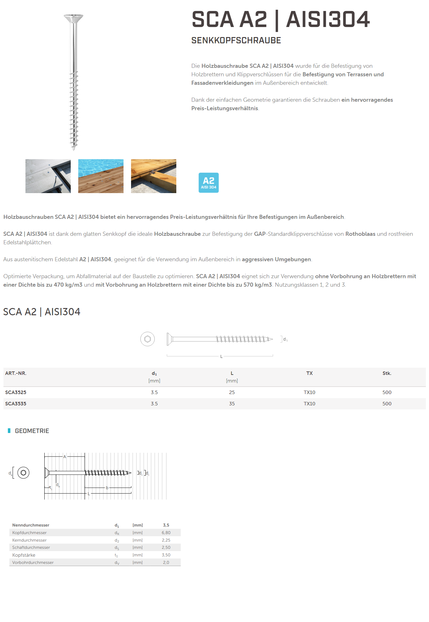 Senkkopf-Terrassenschrauben TX, Typ SCA A2 rostfrei AISI304 3,5x25/18
