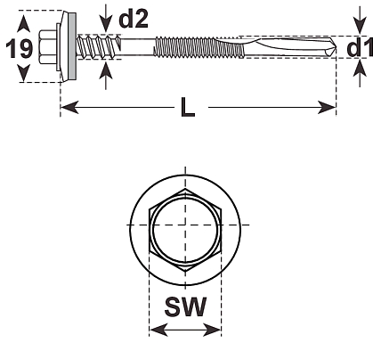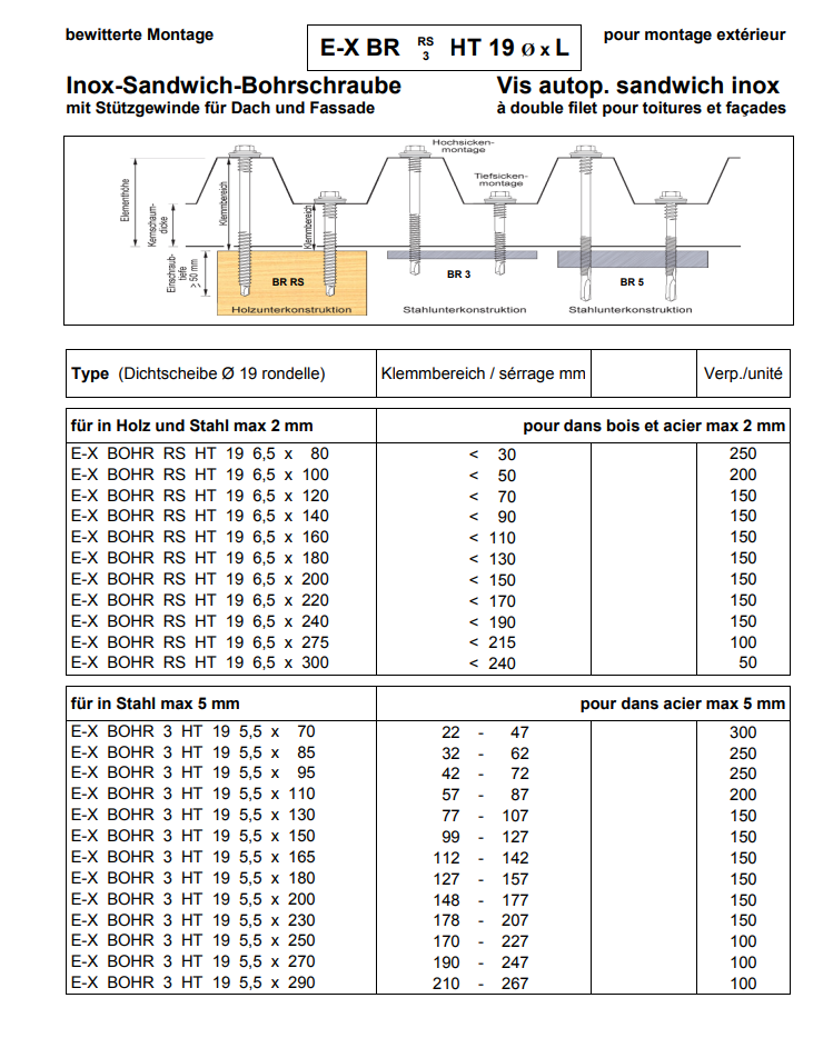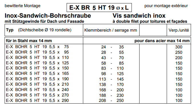 Sandwich Bohrschrauben Dichtscheiben 19mm SW8, E X BR 5 HT-S19 A2 rostfrei 5,5x210 138-170