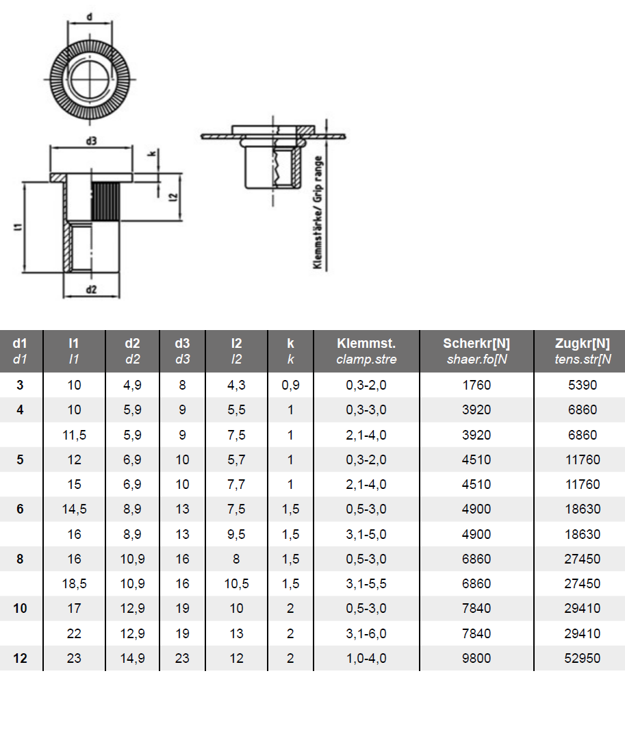 Blindnietmuttern Flachkopf, gerändelt, P1025BB A4-1.4401 rostfrei M4x10 K:0,3-3,0