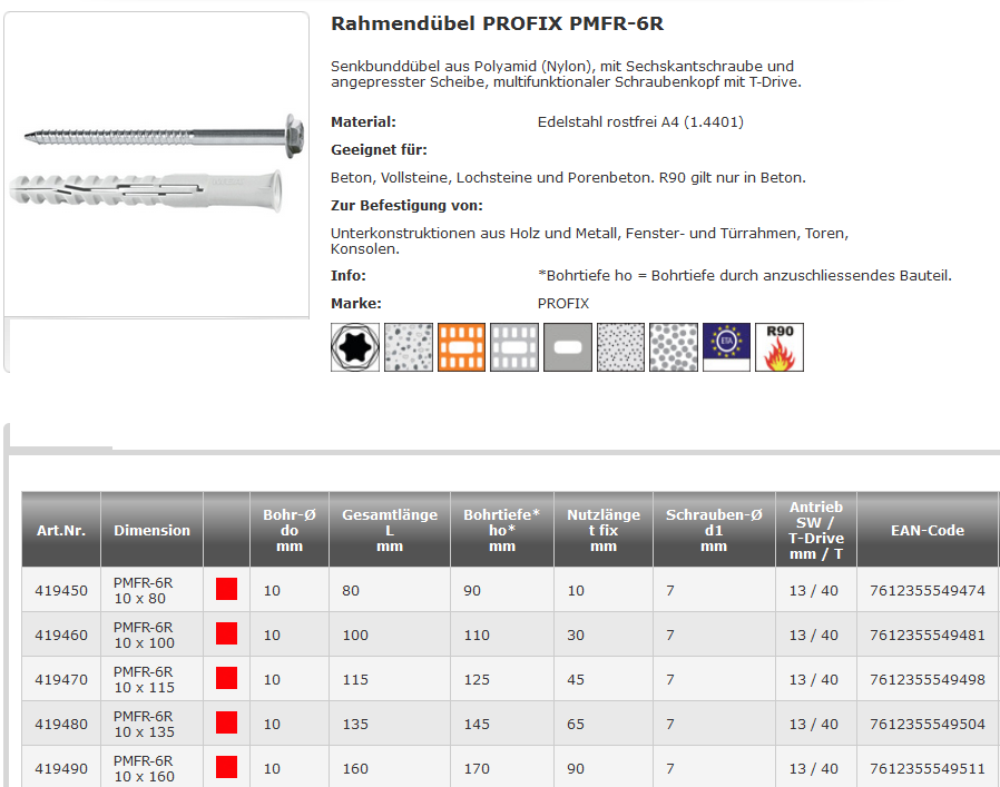 Rahmendübel mit 6kt. Schraube mit Bund TX, PMFR-6R A4 (1.4401) rostfrei 10x135 K:45