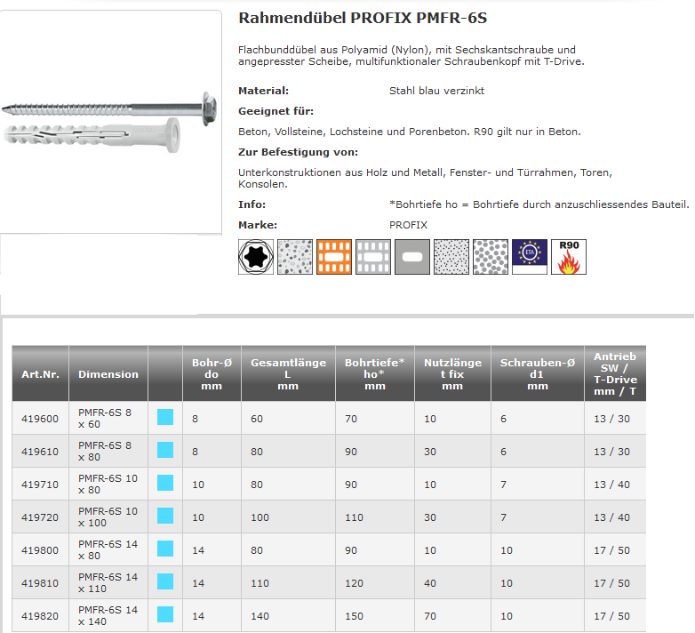 Rahmendübel-FL mit 6kt. Schraube mit Bund TX, PMFR-6S Stahl verzinkt 14x110 K:40