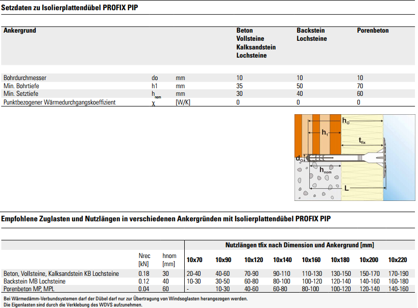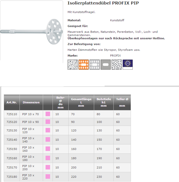 Isolierplattendübel Teller ø60mm, PIP Kunststoff 10x180