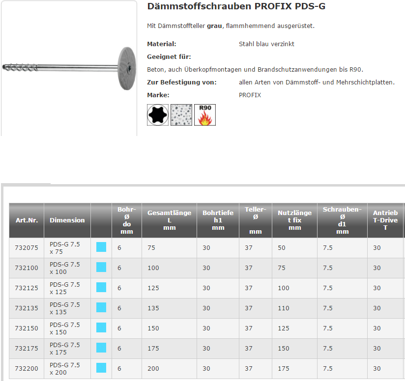 Dämmstoffschrauben Dämmstoffteller ø37mm TX, PDS-G Stahl verzinkt-grau 7,5x125 K:100