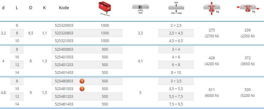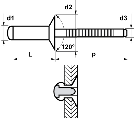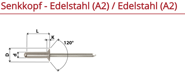 Blindnieten 120° Senkkopf, BN-SK-ST A2-A2 rostfrei 4,8x8 K:1,5-4