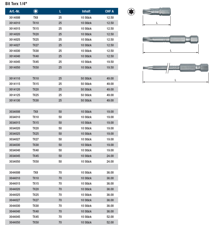 Bit STARCH TX 1/4", S2 Qualität, verchromt TX40x25 1/4"