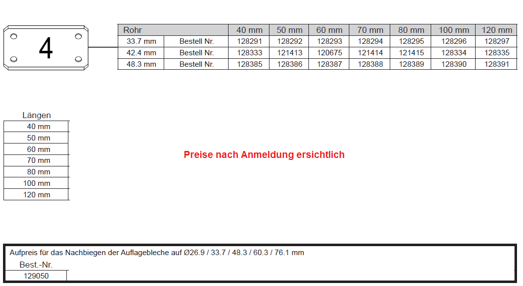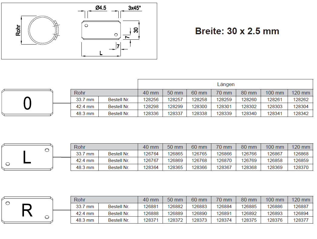 Auflagebleche für Handläufe Breite 30x2,5, Typ 0 Stahl S235JR 48,3x100