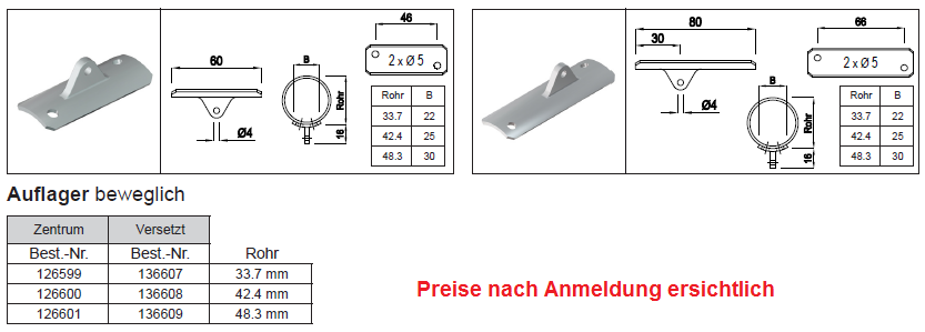 Auflager beweglich Guss Zentrum, Guss CNS 1.4301 42,4x60