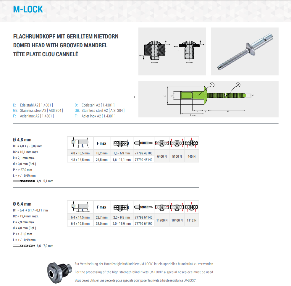 Blindnieten Flachkopf, hochfest, M-LOCK, A2-A2 rostfrei 4,8x10,5 K:1,6-6,9