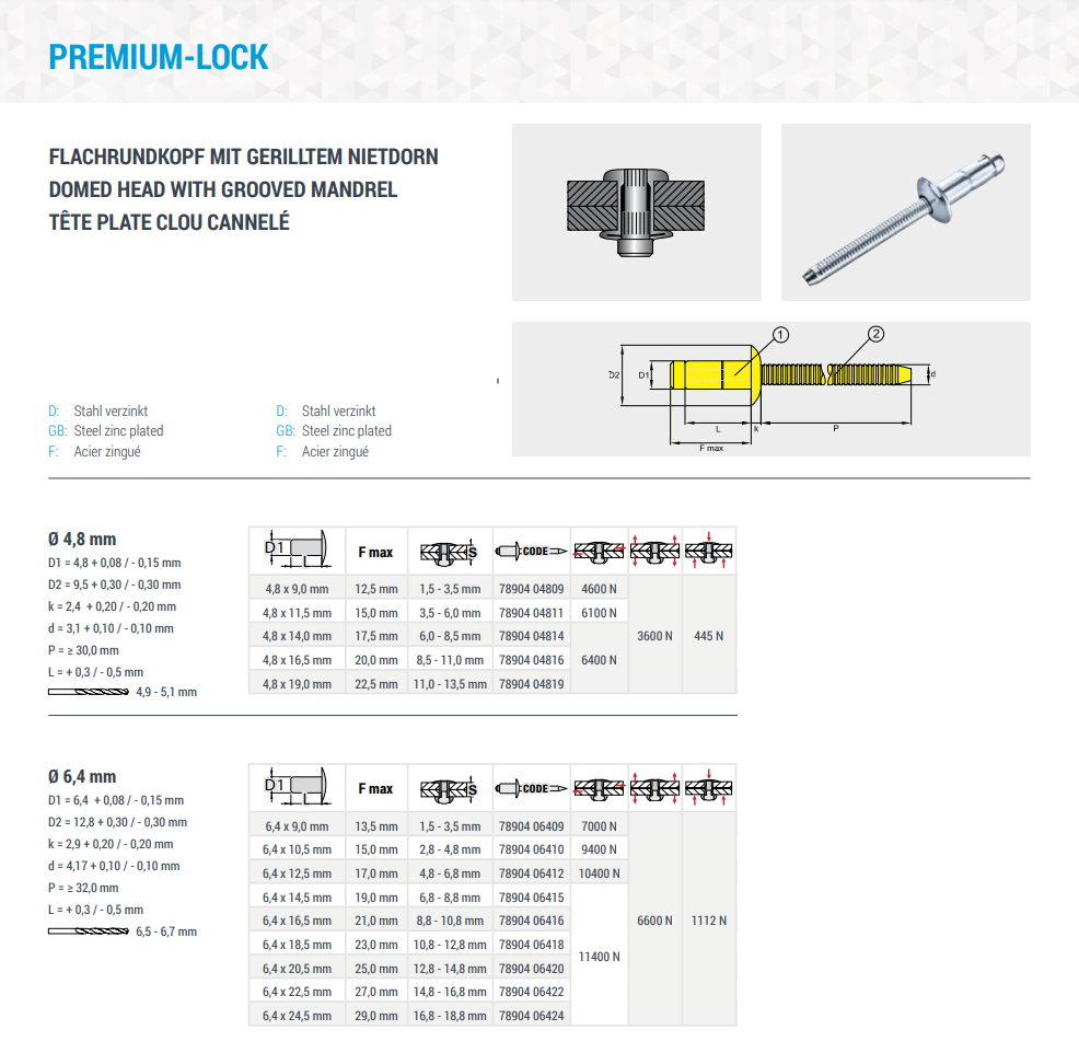 Blindnieten Flachkopf, hochfest, PREMIUM, Stahl verzinkt-Stahl verzinkt 6,4x16,5 K:8,8-10,8