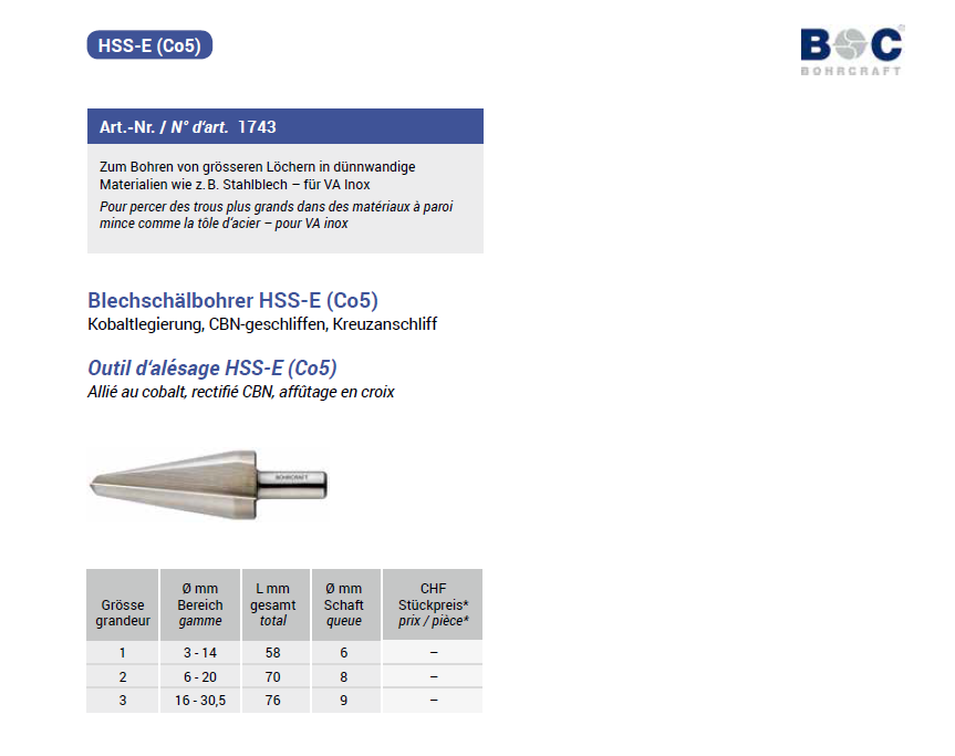 Bohrcraft Blechschälbohrer kobaltlegiert, HSS-E-Co5, CBN geschliffen Gr.1/58 3-14