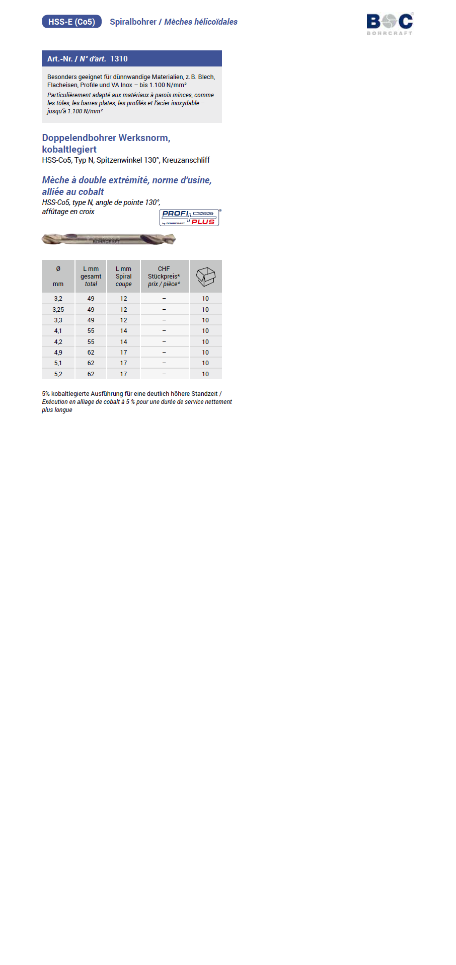 Bohrcraft Doppelendbohrer Werksnorm, geschliffen, Typ N HSS-E-Co5 4,2x55/14