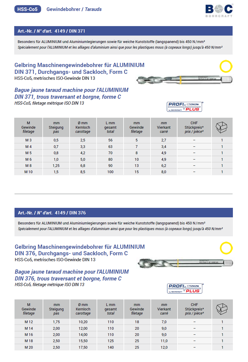 Bohrcraft Gelbring Maschinengewindebohrer 7-tlg., DIN371/376 Form C HSS-Co5 M3-M12