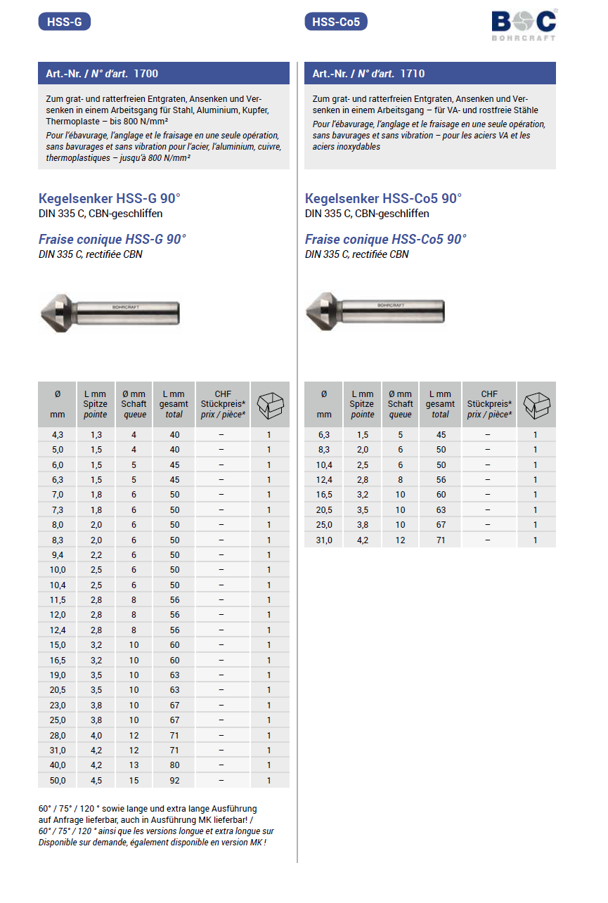 Bohrcraft Kegelsenker 90°, DIN335/Form C HSS-Co5, CBN geschliffen 10,4x50