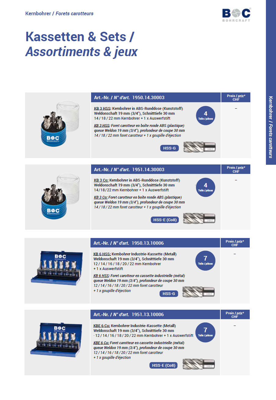 Bohrcraft Kernbohrer mit Weldonschaft SET 7-tlg., Typ KB 6 HSS HSS-G, CBN geschliffen 12-22mm