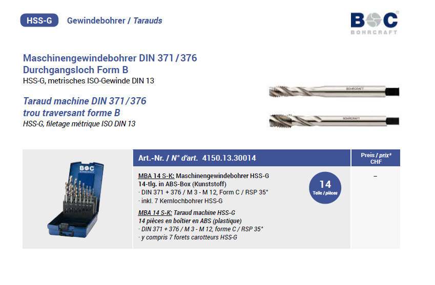 Bohrcraft Maschinengewindebohrer SET 14-tlg., DIN371/376Form C HSS-G M3-M12