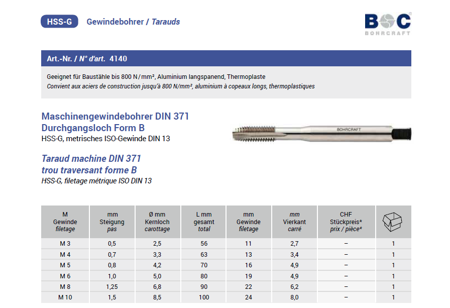 Bohrcraft Maschinengewindebohrer, DIN371/Form B HSS-G M8x90/22