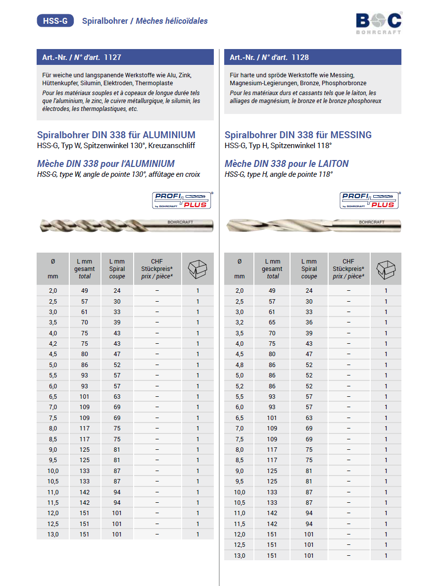 Bohrcraft Spiralbohrer für Aluminium, geschliffen, DIN338/Typ W HSS-G 2,0x49/24