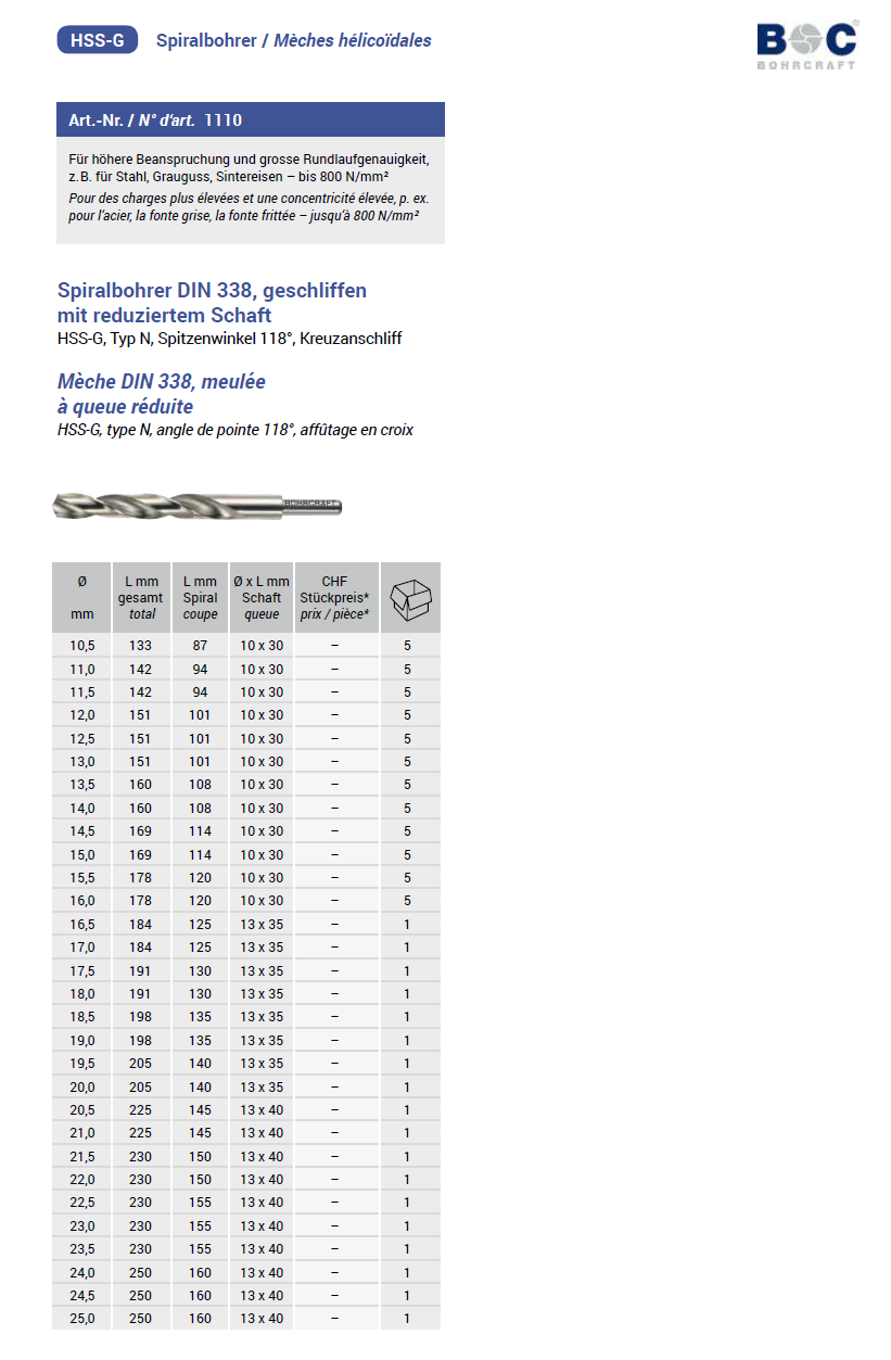 Bohrcraft Spiralbohrer mit reduziertem Schaft, DIN338/Typ N HSS-G 22,0x230/150