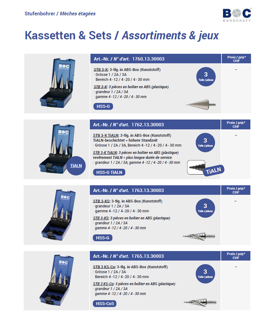 Bohrcraft Stufenbohrer, Kreuzanschliff SET 3-tlg., Typ STB 3-K HSS-G, CBN geschliffen Gr.1/2A/3A
