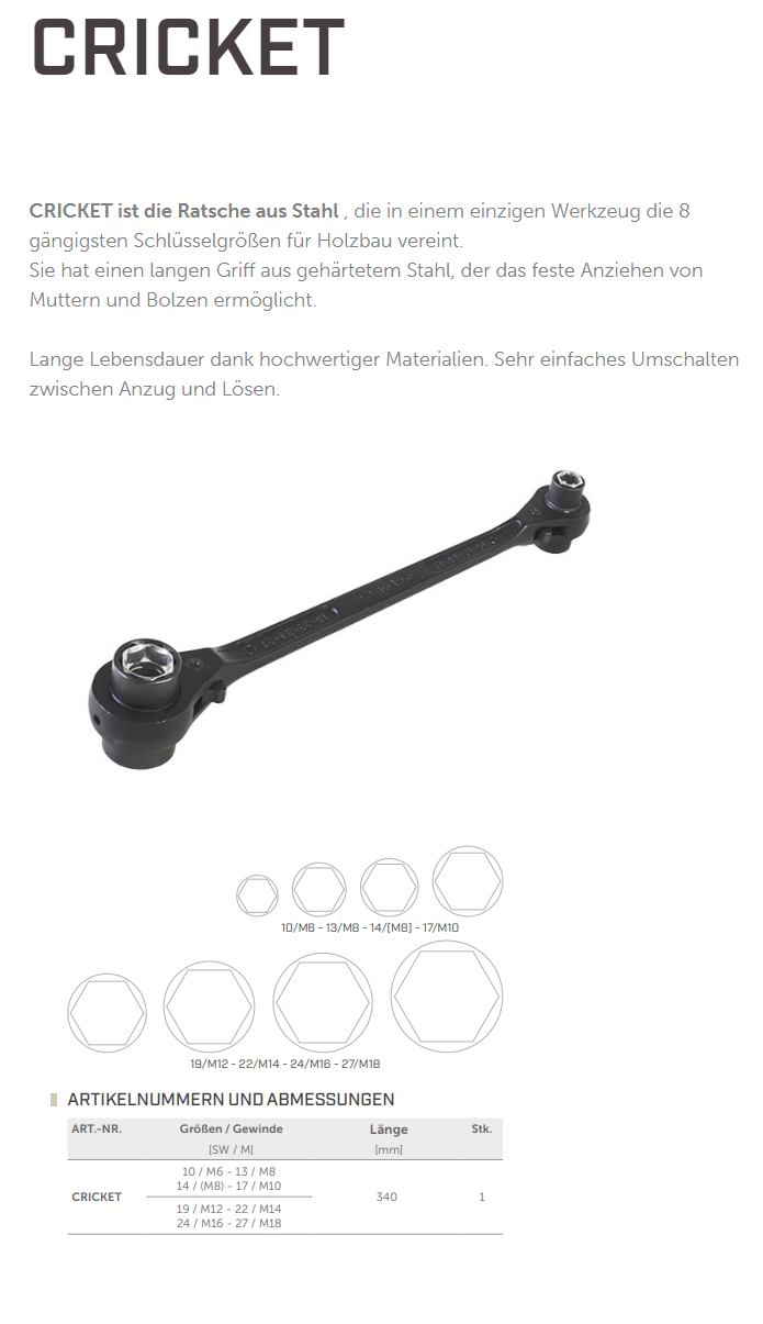 CRICKET Ratschenschlüssel mit 8 Grössen, Stahl 10-27/M6-M18x340