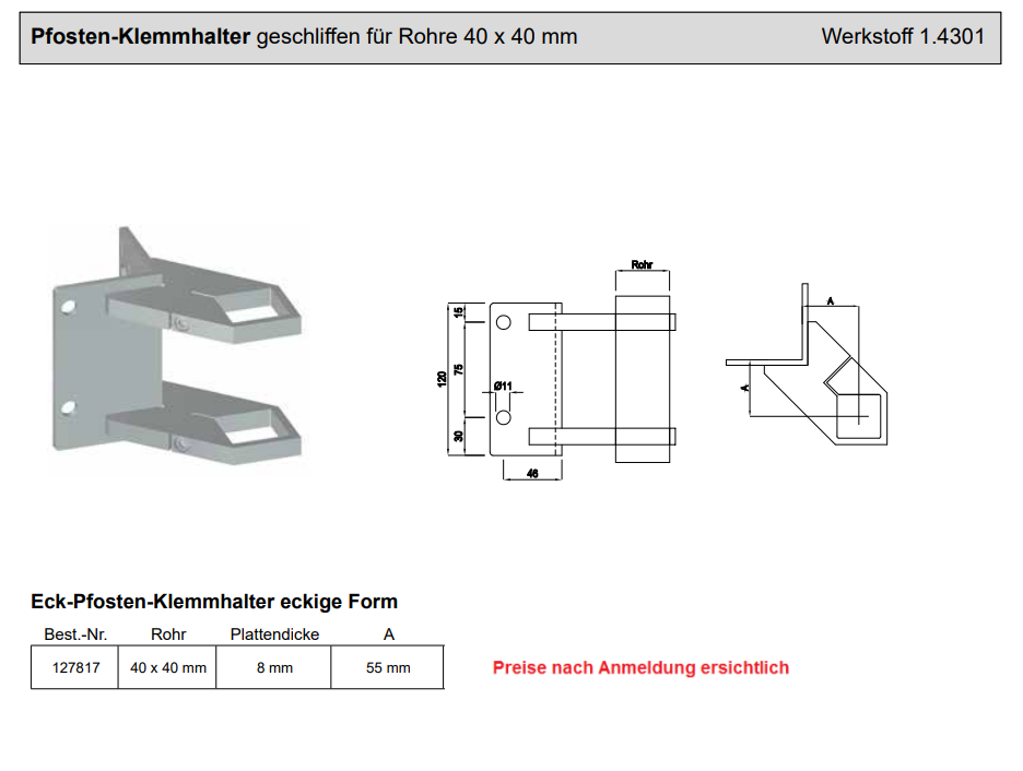 Eck-Pfosten-Klemmhalter eckige Form, CNS 40x40