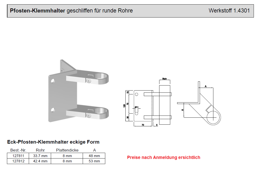 Eck-Pfosten-Klemmhalter eckige Form, rostfrei geschliffen 42,4-53