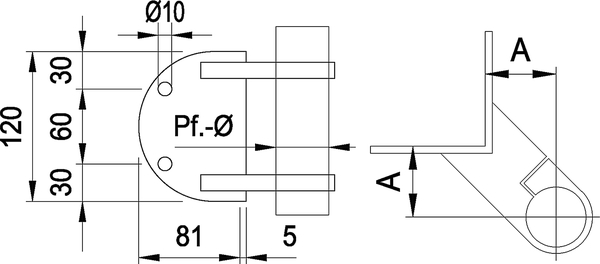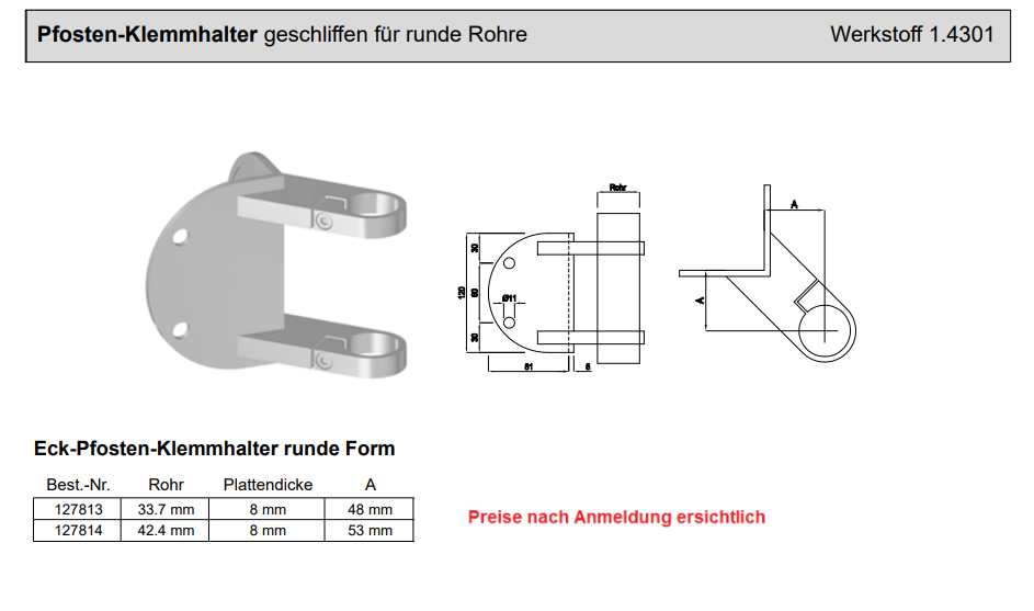Eck-Pfosten-Klemmhalter runde Form, rostfrei geschliffen 42,4-53
