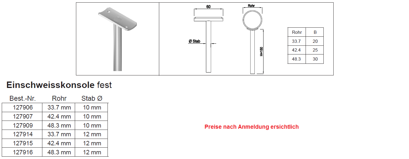 Einschweisskonsole mit festem Auflager, rostfrei 33,7