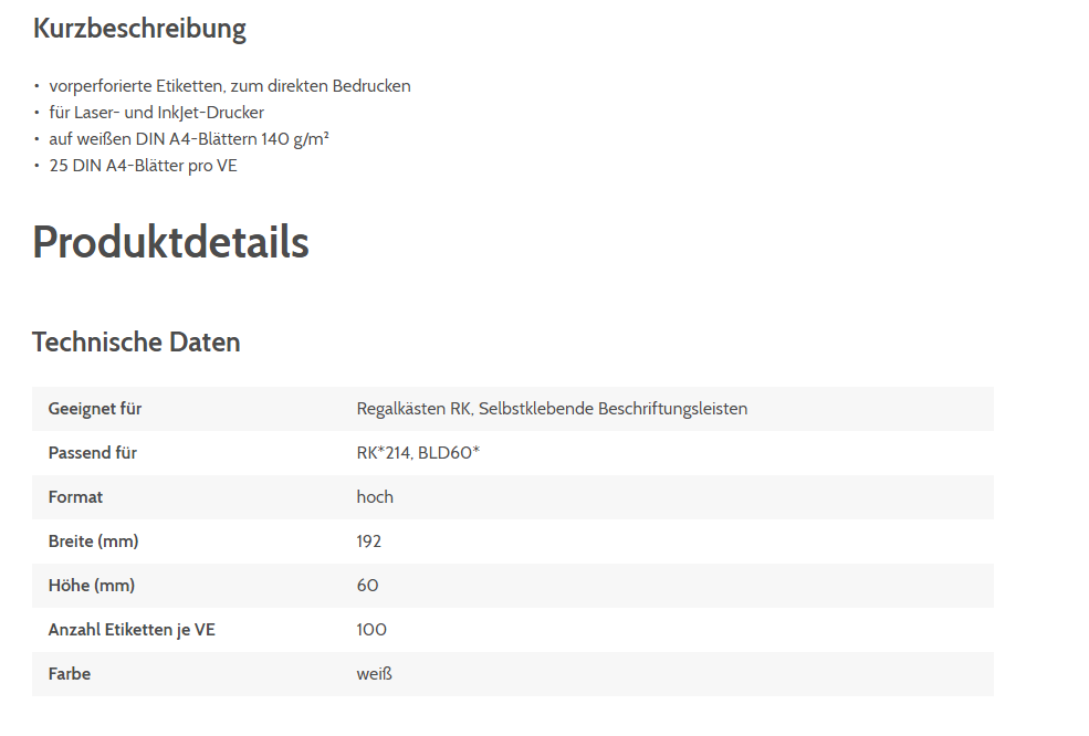 Etiketten BITO für Regalkästen für RK214, BI-46 weiss 192x60