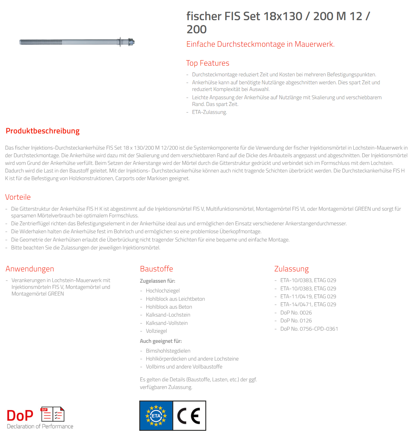 FISCHER Durchsteck-Siebhülsen Set, FIS Stahl verzinkt 18x130/200