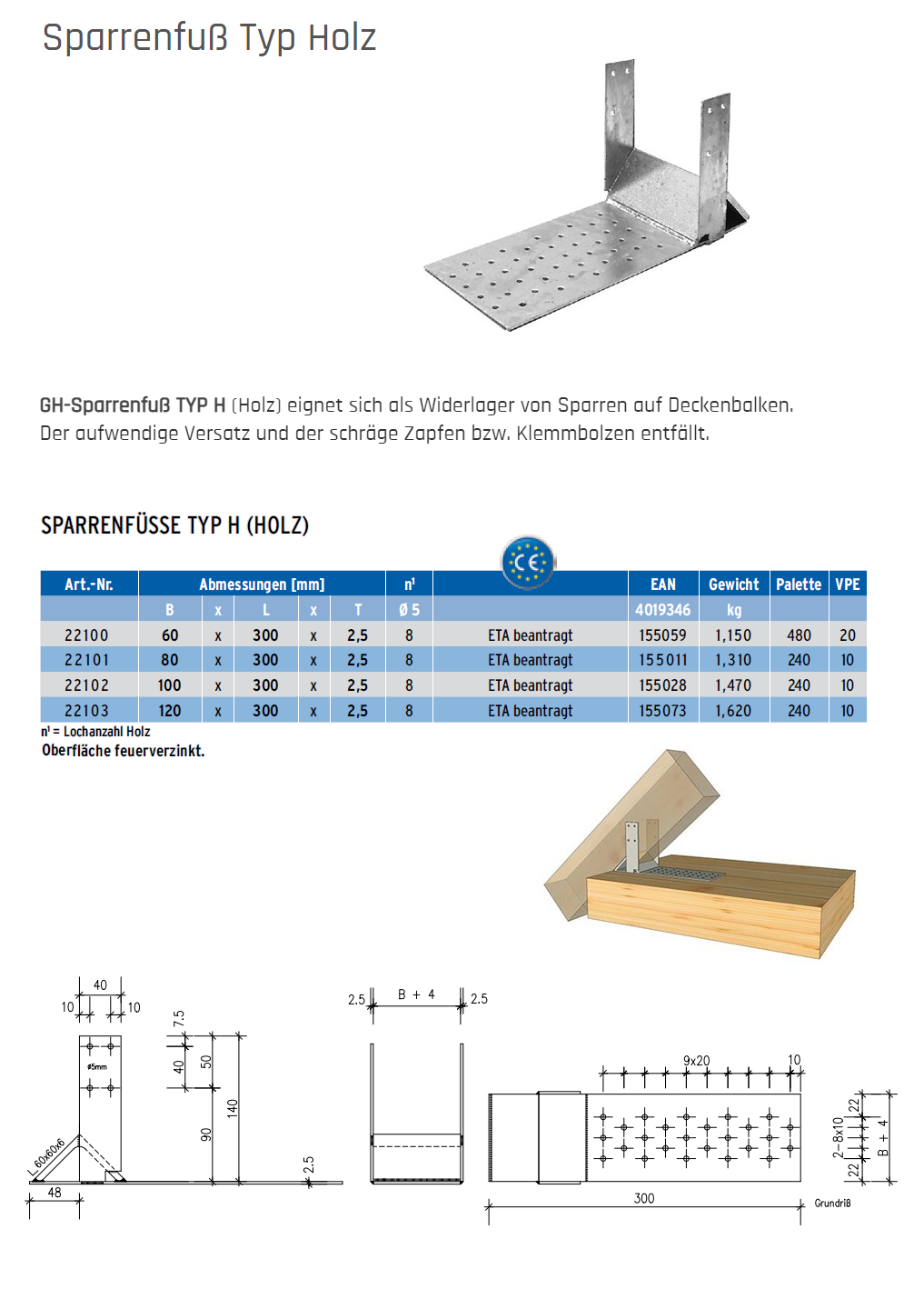 GH-Sparrenfuss mit Laschen, Typ H (Holz) Stahl feuerverzinkt 80x300