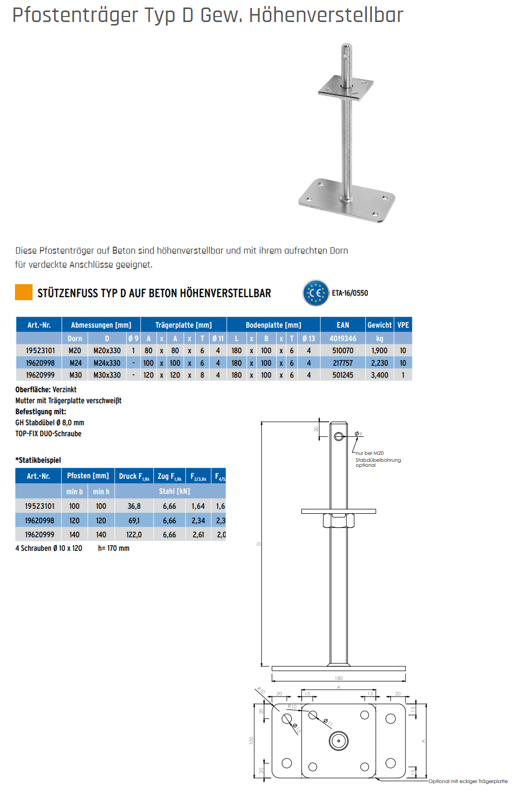 GH-Stützenfuss Typ D auf Beton höhenverstellbar, Typ D M20 Stahl sendzimirverzinkt M20x330