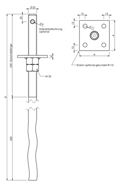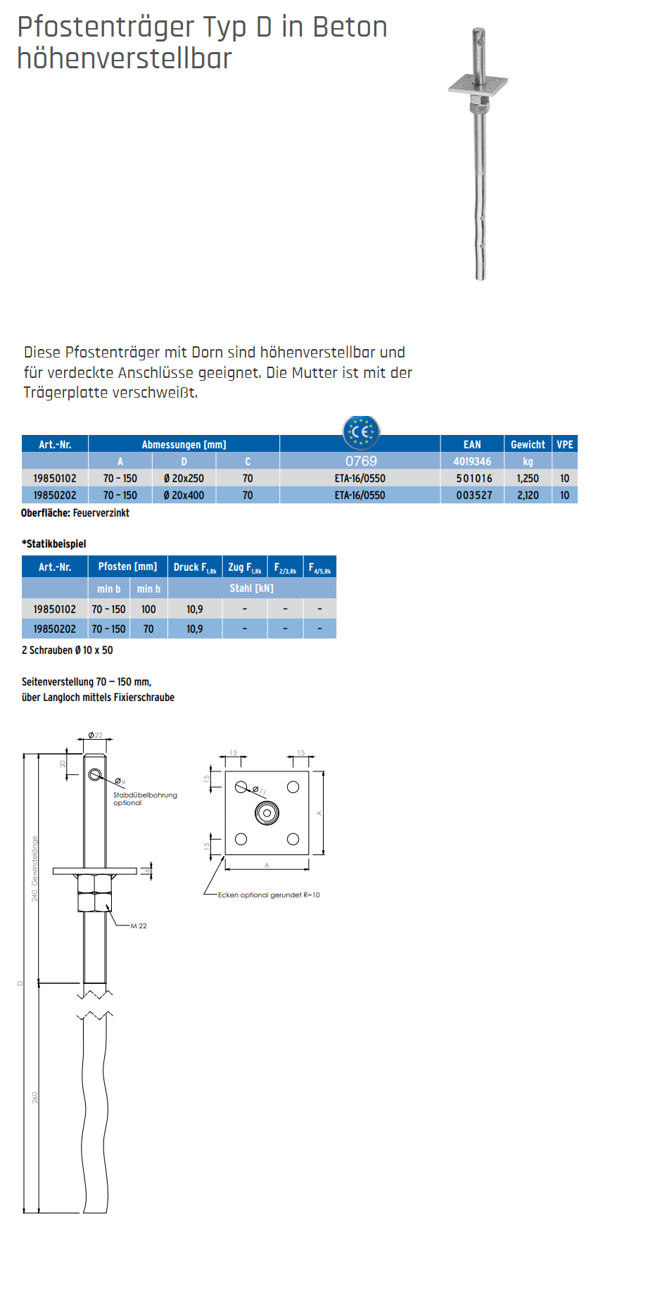 GH-Stützenfuss Typ D in Beton höhenverstellbar, Typ D 100x100 Stahl sendzimirverzinkt ø22x500